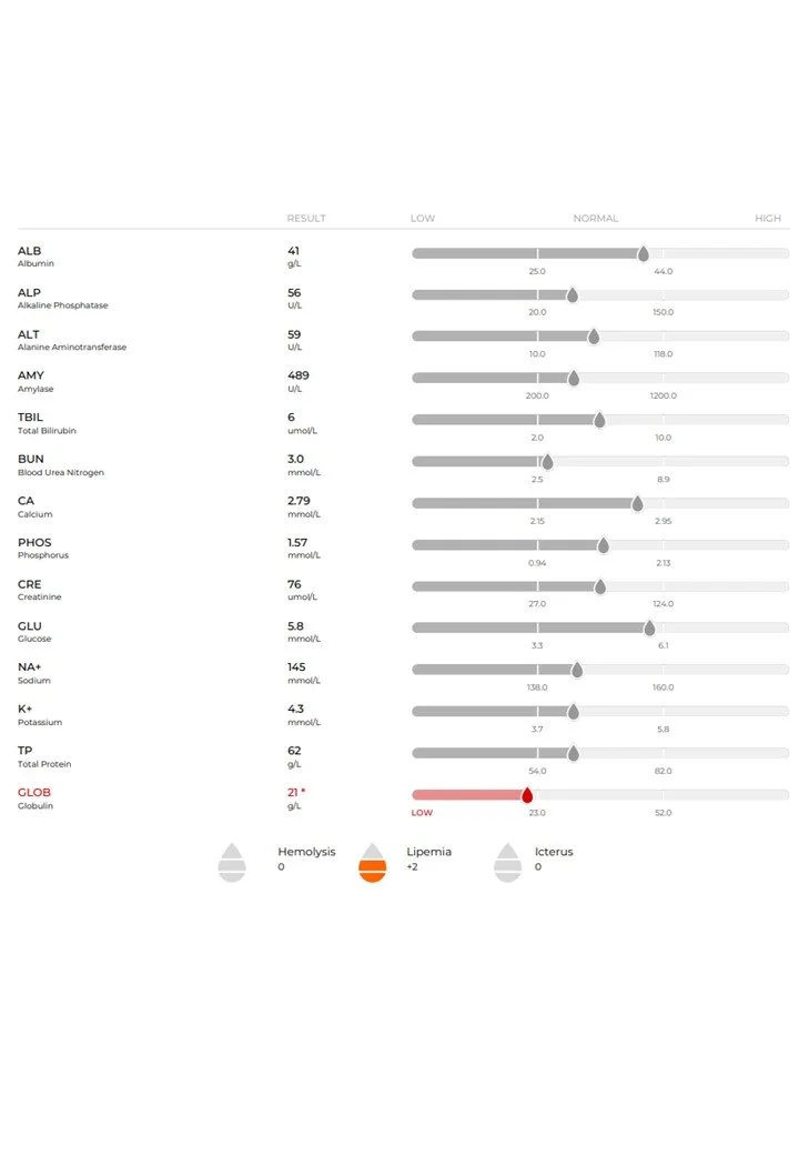 GLOB – globulin Generally related to immune function, low suggests leaking; high could indicate a cancerous problem, or severe infection