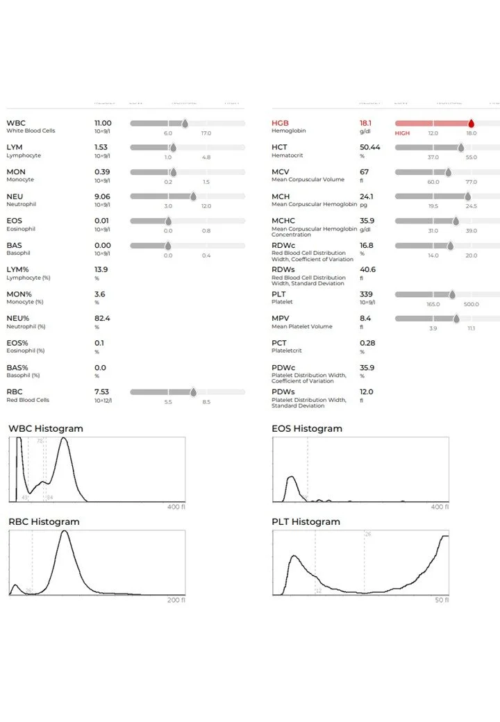 - Haematocrit This is very similar to the total red blood cell count, and moves up and down for much the same reason. This can also be referred to the packed cell volume (PCV) and represents all cells within the blood sample taken.