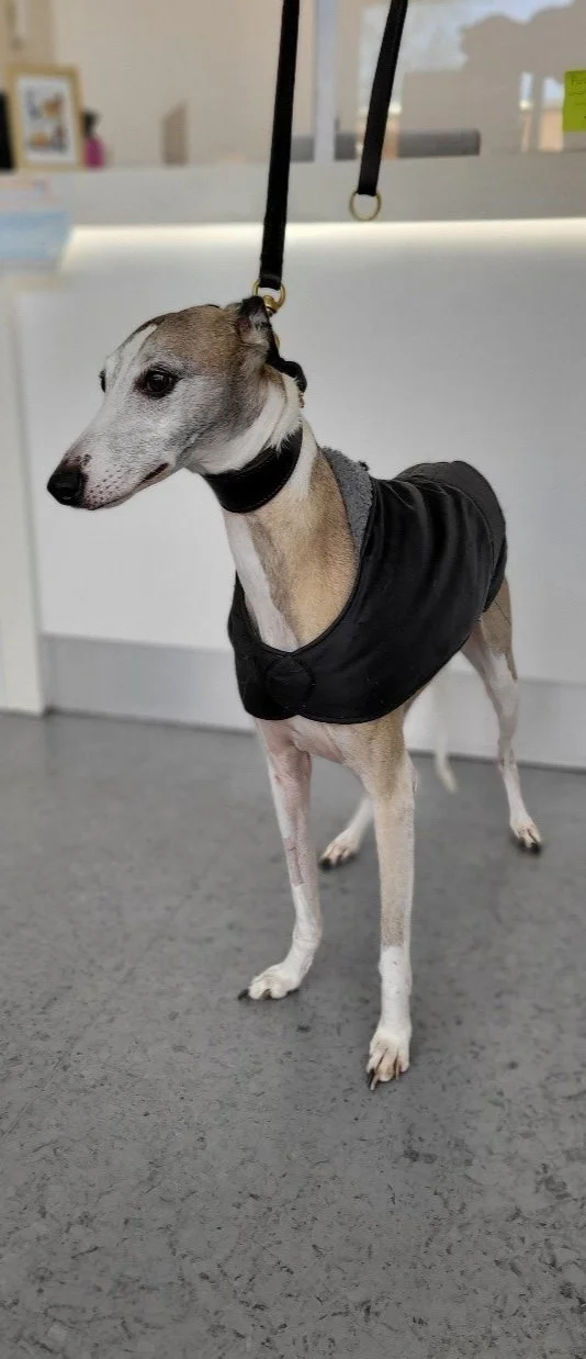 Stan is a beautiful 13 year old Whippet, who recently came into see us to have a rally big lump removed from his back leg.