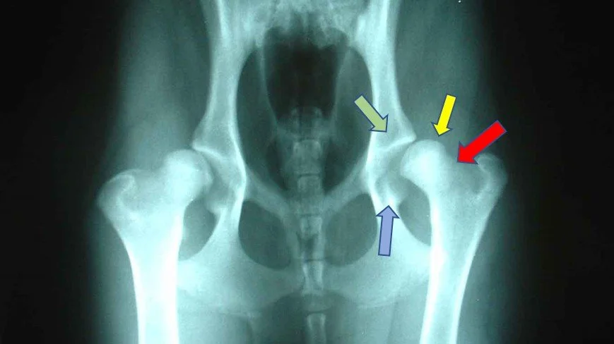 X-rays under an anaesthetic is essential. This allows us to manipulate the joints without causing any pain to our pets and thus get a really good image of the joint. There are several areas we examine on the X-ray shown in the picture.