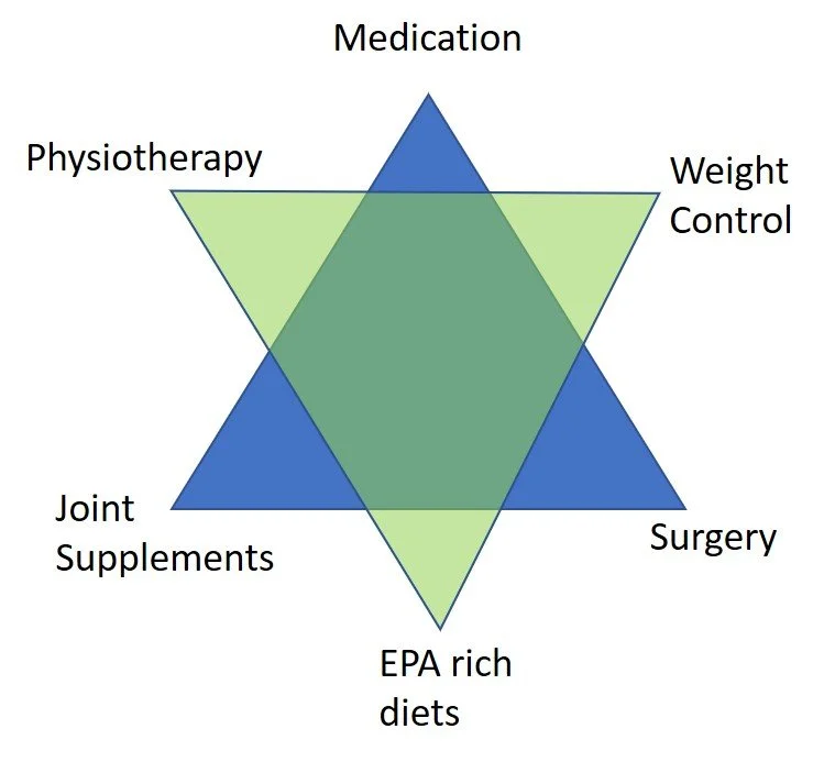 Whilst every patient is different, there are common principles we can employ to guide our management of HD. The picture shows the 6 principles for consideration. The green triangle is what can be done at home, whilst the blue triangle is what we can support within the vet practice. It is always important to consult with a vet, or veterinary nurse to establish an effective treatment plan specific to your pet.